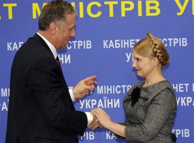 Ukrainian Prime Minister Yulia Tymoshenko, right, and Czech Prime Minister Mirek Topolanek say goodbye after their press conference in Kiev, Ukraine, early hours Sunday, Jan. 11, 2009. Ukraine on Sunday accepted a deal on the European Union-led monitoring of Russian gas transit across its territory, opening the way for restarting Russian natural gas supplies to a freezing Europe after a four-day halt in shipments. [Agencies]