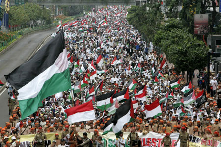 Thousands of demonstrators attend a rally in Jakarta, January 11, 2009 against Israel's attacks on Gaza. [Agencies]