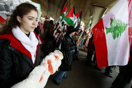 A Lebanese woman carries a doll during a protest in front of the UN headquarters in Beirut, January 11, 2009 against Israel's attacks on Gaza. [Agencies]