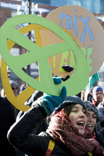 Protesters carry peace signs during a march calling for the end of the Israeli attacks in Gaza in downtown Montreal, January 10, 2009. [Agencies]