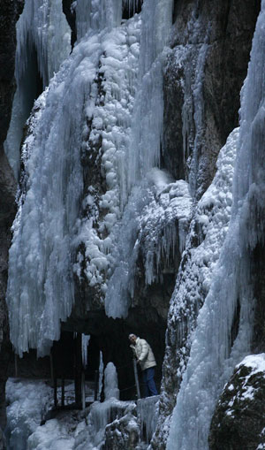 A tourist visits the frozen waterfalls at the famous Partnach Gorge (Partnachklamm) in the Bavarian resort of Garmisch-Partenkirchen, January 12, 2009. About 200,000 visitors make a walk through the gorge every year. [Agencies]