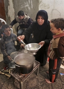 Others face a tougher time. In Khaled al-Dali's two-room shack in the Shati refugee camp, 21 people -- half of them relatives who fled the fighting -- take turns sleeping because there aren't enough mattresses to go around. Without fuel, the family cooks on fires made from trash. He has sold most of his furniture to buy food. Gazans have become adept at coping with conflict, including curfews, street clashes and, most recently, severe shortages created by an 18-month border blockade by Israel and Egypt. But Israel's unprecedented assault on Gaza's Hamas rulers -- with nearly 900 people killed, some 3,400 wounded and tens of thousands displaced -- has strained even their survival skills. The massive bombardment has badly disrupted the flow of electricity and water, already stop-and-go before the start of the war. Israel has cut Gaza in half, cutting north and south off from each other. During the short daylight hours, shoppers crowd the few open stores and outdoor markets in a hunt for scarce goods, from diapers to dairy. At dusk, streets quickly become deserted as civilians retreat indoors, for fear of being mistaken for militants by Israel's military. "Everything is difficult now -- eating, drinking, moving," said Mohammed Saleimeh, 26. When electricity comes on in the Nusseirat refugee camp in central Gaza, the women in his 20-member family rush to bake bread. When water comes on, they wash the cloth diapers they now use instead of disposable ones. In southern Israel, Hamas rocket barrages have also severely disrupted life, sending people rushing into shelters when air raid sirens go off. Many businesses have closed and classes have been suspended, but residents have adequate supplies of food, electricity and fuel. In Gaza, the ability to cope largely depends on how much of a buffer, in food and cash, families had going into the war, and in part on their ties to Gaza's Hamas rulers. Mohammed Awad, a senior Hamas official, told the movement's Al Aqsa TV on Sunday that 25,000 people on the Hamas payroll, from police to civil servants, have received their December salaries. Hamas members said the money is being paid in cash, with Hamas activists making the rounds to distribute it. A man with a trimmed beard was seen handing out money from a suitcase in the hallway of a building in one Gaza City neighborhood, then asking employees to sign a receipt. Abu Ramadan is a former member of the security forces ousted during Hamas' violent takeover of Gaza in June 2007, and still draws his salary from Hamas' rival, the West Bank government of moderate Palestinian President Mahmoud Abbas. He can still afford to buy drinking water and fill up the tank on the roof of his high-rise in the Sheik Radwan neighborhood of Gaza City. But electricity outages are constant -- power came on Sunday for the first time in eight days. So he heads to the mosque each morning to charge his cell phone, instead of praying at home as he did before the war. His family of five eats lentils, beans and canned foods. Tomatoes are available, but have tripled in price, to 75 cents a pound. Only 20 of 47 bakeries are operating, according to the bakers' union, explaining the long lines for bread. In the Shati camp, al-Dali, 33, was already broke at the start of the fighting, struggling to feed his wife and seven children, ages 5 through 14. A few days ago, he took in his sister, her husband and 10 children, who fled shelling outside their home close to the border with Israel. They escaped with just the clothes on their backs. On Monday, al-Dali's sister Salwa, 42, was stirring a pot of lentils and rice on a fire of paper, cardboard cartons and other debris. The refrigerator was empty, except for a few onions and tomatoes. Salwa said she added extra salt to the cooking water in the belief that it would help rid it of germs. Many Gazans have taken to boiling drinking water too, since local water authorities warned of deteriorating quality last week. She said she tries to feed the kids as late in the day as possible so they don't go to bed hungry. Al-Dali said the food will last until Tuesday, and he doesn't know where the next meal will come from. "I have no other business but to secure something to eat, water to drink and some wood and paper to warm them during the night," he said. "I feel ashamed of myself. I can do nothing for them." In Zahra City, a complex of high-rises south of Gaza City, school teacher Jihan Sarsawi said she now washes in a bucket because running water is scarce — but only if there's no shelling. "I'm afraid they'll shell the building and I'll be undressed, which would be really embarrassing, so last night I slept in my clothes, without bathing," she said. Sarsawi also abstains from food and drink from sunrise to sunset every Monday and Thursday. "It lengthens out the food rations," she said. Israel has allowed some humanitarian aid convoys to enter, but the shipments and distribution are often disrupted by fighting. As many 88 percent of Gaza's residents now require food aid, and the three-hour lull in fighting that Israel allows for humanitarian aid to move around Gaza is not sufficient, said Helene Gayle, president of the international aid agency CARE. Gaza economist Omar Shaban, who lives in the town of Deir al-Balah in central Gaza, said his house gets six hours of electricity a day and running water twice a week, for about eight hours. He has a small garden where he occasionally plays football with his sons, ages 10 and 16. Central Gaza has suffered less destruction than Gaza City, and Shaban said his family manages to get out of the house almost every day, for trips to the market or relatives in town. Most shops are closed, he said. Supermarket owner Zaher Abdel Hadi in Gaza City said he's selling mostly on credit now because people are broke or can't get their money out of the bank because of a long-standing cash shortage. "No one is leaving empty-handed," he said of his customers. "We have to be br