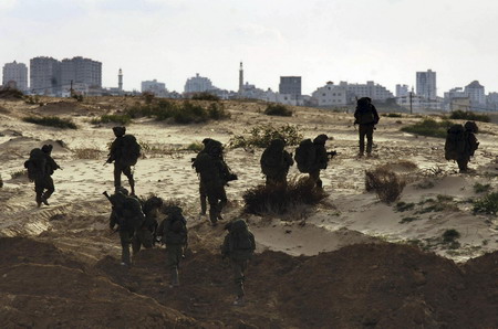In this photo released by the Israeli Defence Forces (IDF), Israeli soldiers walk towards the northern Gaza Strip January 12, 2009. An Israeli military spokesman said army reservists had been thrown into the campaign that Israel launched with the declared aim of ending cross-border rocket attacks from the Hamas-ruled territory to its south. [Agencies]