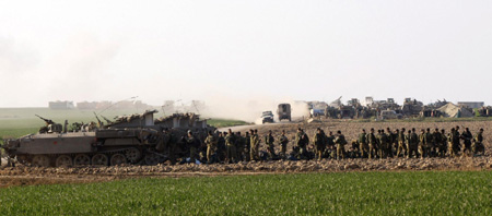Israeli soldiers stand near armoured personnel carriers (APC) just outside the Gaza Strip January 12, 2009. Israeli troops fought fierce gun battles with Hamas fighters on Monday, keeping military pressure on the Islamist group while avoiding urban warfare that would complicate ongoing diplomatic efforts to end the Gaza war. [Agencies]