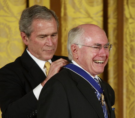 Former Australian Prime Minister John Howard (R) receives the Presidential Medal of Freedom from US President George W. Bush during a ceremony in the East Room of the White House in Washington, January 13, 2009. The award is the highest civilian honour that is given in the United States. [Agencies]