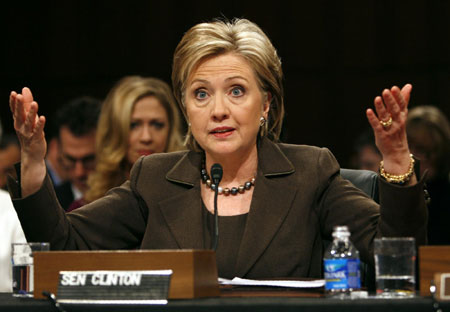 Senator Hillary Clinton testifies before the Senate Foreign Relations Committee during her confirmation hearing on Capitol Hill in Washington to become the next US Secretary of State January 13, 2009. Sitting behind her is daughter Chelsea. [Agencies]