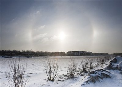 A sundog, or solar halo, appears in the sky above snowy Omaha, Neb., Wednesday, Jan. 14, 2009. Residents face a midday temperature of 3 degrees Fahrenheit and a wind chill of -20 as the Midwest faced an arctic cold wave.[Agencies]