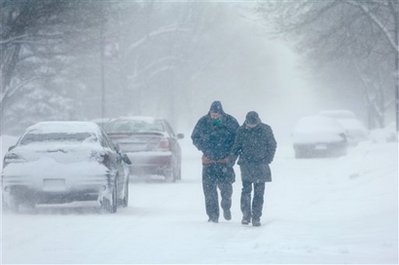 The Rev. Ron Gramza, left, and Javier Guativa head north on Main Street in Racine, Wis., Wednesday morning, Jan. 14, 2009, as they walk to the post office to mail a letter. A winter storm dropped several inches of snow on the Racine area Wednesday. [Agencies]