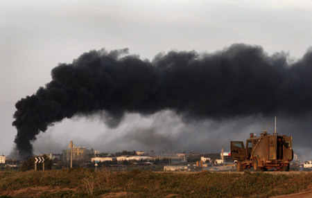 An Israeli soldier stands in a military jeep near the border as smoke rises from across the border in the northeast Gaza Strip January 15, 2009. Israeli tanks and artillery pounded Gaza city in a relentless barrage of shelling on Thursday, despite some signs of progress in the international effort to bring about a ceasefire to the 20-day conflict. [Agencies]