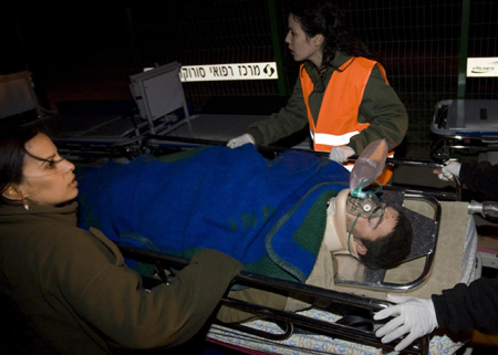 An Israeli soldier, wounded during Israel's offensive in Gaza, is wheeled into Soroka hospital in the southern city of Beersheba January 14, 2009. Ceasefire negotiations intensified on Wednesday as Israeli forces kept up the pressure on Hamas Islamists in the Gaza Strip, where the Palestinian death toll rose above 1,000 after 19 days of air and ground attacks. [Agencies]