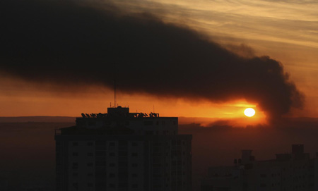 Smoke rises during Israel's offensive in Gaza January 15, 2009. Israeli tanks and artillery pounded Gaza city in a relentless barrage of shelling on Thursday, despite some signs of progress in the international effort to bring about a ceasefire to the 20-day conflict. [Agencies]