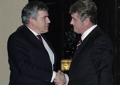 British Prime Minister Gordon Brown (L) greets President Viktor Yushchenko of Ukraine outside 10 Downing Street in London. Brown pressed for an urgent solution to Kiev's gas row with Moscow during his talks with Yushchenko. [Agencies]
