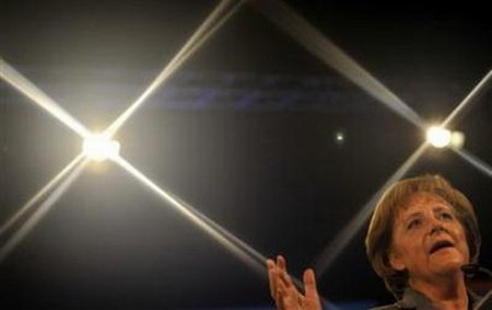 German Chancellor Angela Merkel delivers a speech during an election campaign for Hesse's state Prime Minister and top candidate for his conservative Christian Democratic Union (CDU), Roland Koch in Frankfurt, January 15, 2009. [Agencies]