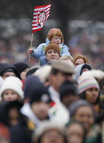 A child holds a flag with a picture of US President-elect Barack Obama as she attends the We Are One: Opening Inaugural Celebration, held in honor of US President-elect Barack Obama, at the Lincoln Memorial in Washington January 18, 2009. [Agencies]