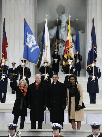 US President-elect Barack Obama (2nd R) and his wife Michelle (R) stand with Vice President-elect Joe Biden (2nd L) and his wife Jill on the steps of the Lincoln Memorial during the We Are One: Opening Inaugural Celebration in Washington January 18, 2009. [Agencies]