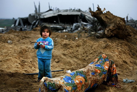 A Palestinian girl stands in front of a destroyed house on the outskirts of Jabalya in the northern Gaza Strip January 19, 2009. More Israeli forces left the Gaza Strip on Monday after a 22-day assault on Hamas militants, and both sides kept a ceasefire, allowing dazed Palestinians to survey the destruction and mourn their dead. [Agencies]