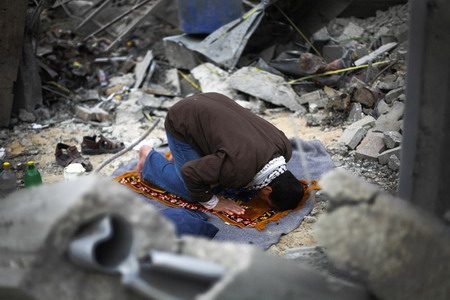 A Palestinian man prays in the rubble of his house in Beit Lahiya, in the northern Gaza Strip January 19, 2009. More Israeli forces left the Gaza Strip on Monday after a 22-day assault on Hamas militants, and both sides kept a ceasefire, allowing dazed Palestinians to survey the destruction and mourn their dead. [Agencies]