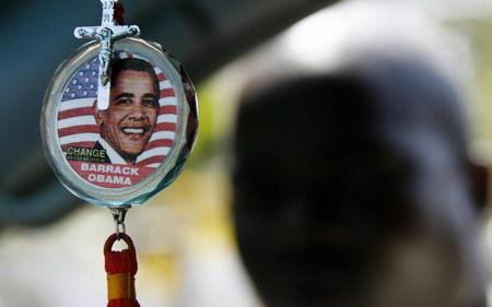 A crucifix is seen next to an ornament bearing the portrait of US President-elect Barack Obama, in Kenya's western town of Kisumu, 355km west of the capital Nairobi, January 19, 2009. [Agencies]