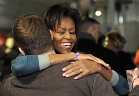 Michelle Obama, the wife of US President-elect Barack Obama, hugs someone as she celebrates National Day of Service by helping volunteers with 'Operation Gratitude' and 'Serve DC' by assembling care packages for US troops overseas, in Washington January 19, 2009. [Agencies]