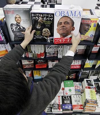 A seller displays books featuring US president-elect Barack Obama at a bookstore in Tokyo January 20, 2009. Obama's speeches are proving a best-seller in Japan -- as an aid to learning English. An English-language textbook, "The Speeches of Barack Obama", has sold more than 400,000 copies in two months. [Agencies]