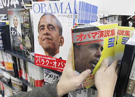 A seller displays English-language textbooks called "The Speeches of Barack Obama" at a bookstore in Tokyo January 20, 2009. [Agencies]