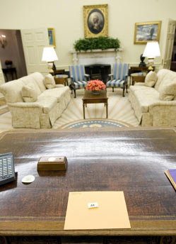Obama intends to name former Senate Majority leader George Mitchell as a special envoy to the region. Not everything was new at the White House. In the Oval Office, Obama worked at a desk built from the timbers of a British naval vessel, the HMS Resolute, and used off-and-on by presidents since the 1870s, including Bush. It also appeared that the carpet that Bush used in his second term, a yellow sunbeam design, was still in place.