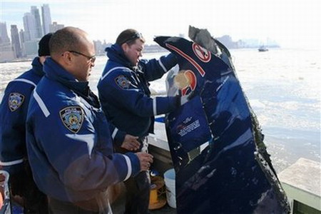 A single feather was found attached to a flap track on the wing and will be examined by experts at the Smithsonian Institution. The pilot of Flight 1549, Chesley "Sully" Sullenberger, reported a "double bird strike" and a loss of power in both engines before gliding the plane to an emergency river landing last week. All 155 people on board the flight to Charlotte, N.C., survived. The board also reported Wednesday that divers located the airliner's left engine in about 50 feet of water near the area of the river where the aircraft ditched. The board predicted the engine would be recovered Thursday. Apart from that, on Jan. 13, two days before the accident, the aircraft's right engine experienced a power surge. Subsequent maintenance work included the replacement of a temperature probe. "Investigators from the NTSB's maintenance records group are researching this report by examining applicable maintenance records and procedures," the board said in a statement. New York Police Department and New Jersey State Police harbor officers working with a sonar expert from the National Oceanographic and Atmospheric Administration got a reading Tuesday of an object 16 feet long and 8 feet wide near the spot where Flight 1549 made its emergency landing. Divers went into the icy, murky water and located the left engine in about 10 minutes, NYPD spokesman Paul Browne said. Investigators want to inspect the engine to better understand how it stopped running after the plane hit a flock of birds shortly after taking off from LaGuardia Airport. Most of the Airbus A320 is at a New Jersey marina, where investigators will study it. Police already located several pieces of debris from the flight, including 35 flotation seat cushions, 12 life jackets, 15 pieces of luggage, two briefcases, 11 purses, 15 suit jackets and shirts, four shoes and two hats, Browne said. |