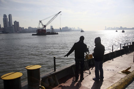 ![]() Members of the press watch as the left engine of the US Airways jetliner that crash landed in the Hudson River last week is lifted out of the water in New York January 23, 2009. [Agencies]