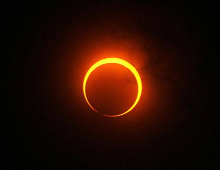 The Moon passes between the Sun and the Earth during an annular solar eclipse as seen from Bandar Lampung, Indonesia Lampung province January 26, 2009. Photograph taken with solar filter on a lens.[Agencies]