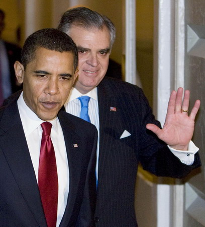 US President Barack Obama (L) walks with US Secretary of Transportation Ray LaHood to a meeting with Republican members of the House of Representatives about his economic stimulus package while on Capitol Hill in Washington, January 27, 2009. [Agencies]