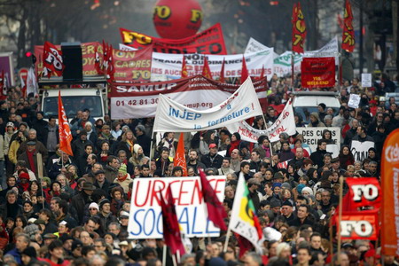 Public and private sector workers carry banners and union flags as they demonstrate during a protest march in Paris, January 29, 2009. More than a million of French workers staged a nationwide strike on Thursday to try to force the government to do more to protect jobs and wages during the economic crisis.[Agencies]