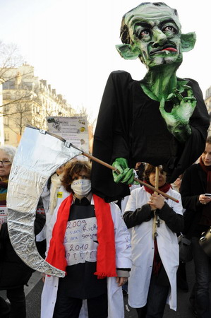 A caricature of France's President Nicolas Sarkozy is held by French public and private sector workers during a protest march in Paris, January 29, 2009.[Agencies]