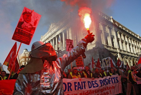 Arcelor Mittal steel workers demonstrate during a protest march in Marseille January 29, 2009. France's eight labour unions have called on public and private sector workers to go on strike on Thursday to demand more action from government and companies to protect jobs and salaries.[Agencies]