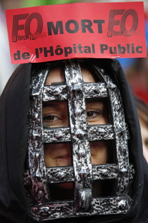 A hospital employee demonstrates during a protest march with public and private sector workers in Strasbourg January 29, 2009. Hundreds of thousands of teachers, nurses, factory workers and plumbers marched through French cities on Thursday to demand pay rises and protection for jobs.[Agencies]