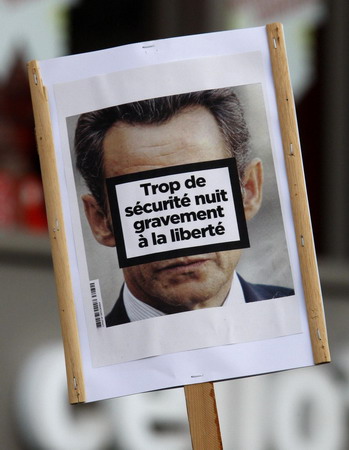 A demonstrator holds the portrait of France's President Nicolas Sarkozy with the slogan "too much security harms liberty gravely" during a protest march with public and private sector workers in Strasbourg, January 29, 2009.[Agencies]