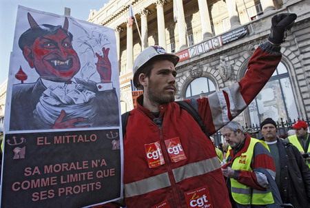 An Arcelor Mittal worker holds a sign which portrays Chairman and Chief Executive Officer Lakshmi Mittal as the devil holding a bag of money and reads, 'The Mittal Devil - His Morals are only Limited by His Profits", during a protest march in Marseille, January 29, 2009. France's eight labour unions have called on public and private sector workers to go on strike on Thursday to demand more action from government and companies to protect jobs and salaries.[Agencies]