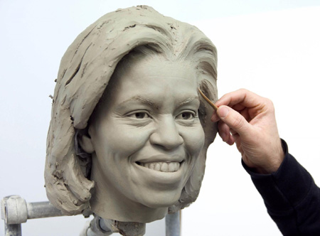 Senior Sculptor Colin Jackson works on a clay head mold of US first lady Michelle Obama at Merlin Studios in London in this photograph released on January 28, 2009. The clay molds are a crucial step in the up to six month-long figure creation process. The full wax figure will be unveiled at Madame Tussauds Washington DC in March. [Agencies]