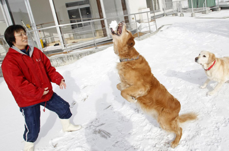 Keiko Tsuji, care-taker for retired guide dogs, plays with them on the snow at an asylum for retired guide dogs in Sapporo, northern Japan, February 2, 2009. Most guide dogs over 12 years old are retired from service due to their declining physical strength. More than 200 retired guide dogs have lived their remaining years in the facility since the Hokkaido guide dogs association opened the care center in 1978, authorities said. [Agencies]