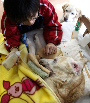 Keiko Tsuji, care-taker for retired guide dogs, feeds Rick on a bed at an asylum for retired guide dogs in Sapporo, northern Japan, February 2, 2009. Rick, who is 16 years old, is immobile. Most guide dogs over 12 years old are retired from service due to their declining physical strength. More than 200 retired guide dogs have lived their remaining years in the facility since the Hokkaido guide dogs association opened the care center in 1978, authorities said. [Agencies]