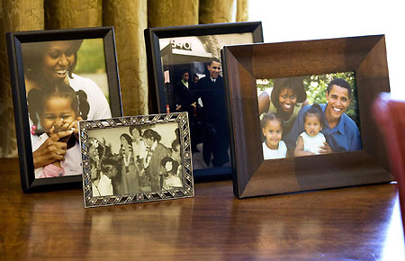 Personal photographs sit behind the desk of US President Barack Obama in the Oval Office of the White House in Washington, February 2, 2009. [Agencies]