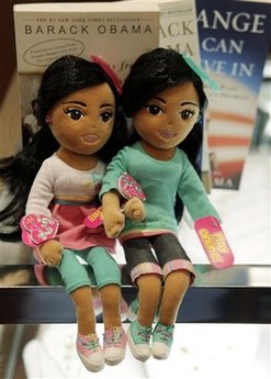 Pictured are the Sweet Sasha, left, and Marvelous Malia dolls made by Ty Inc., the creators of the Beanie Babies at Lamont's gift shop inside the Ritz-Carlton Hotel in Chicago, Wednesday, Jan. 21, 2009. The daughters of US President Barack Obama are the inspiration for the latest in the TyGirlz Collection.[Agencies]