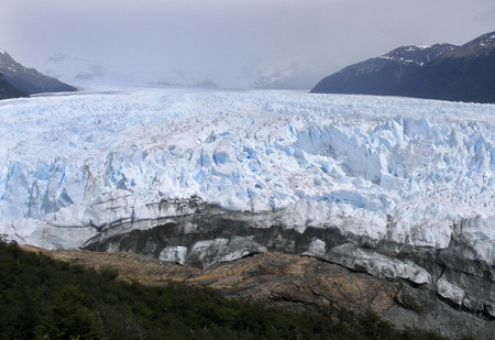 A general view of the leading edge of Perito Moreno glacier in the southern Patagonia region near El Calafate, January 3, 2009. While most of the world's glaciers are melting away because of warmer temperatures, scientists say the Perito Moreno ice field, known as "The White Giant", is gaining as much as 3 meters (10 feet) a day in some parts, pushed forward by heavy snowfalls in the Patagonia region. [Agencies]