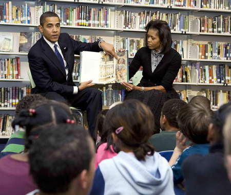 US President Barack Obama (top,L) and first lady, Michelle Obama (top,R) talk to second grade students at the Capital City Public Charter School (Lower School) in Washington February 3, 2009. [Agencies]