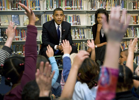 US President Barack Obama (top,L) and first lady, Michelle Obama (top,R) talk to second grade students at the Capital City Public Charter School (Lower School) in Washington February 3, 2009.  [Agencies]