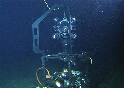 Updated: 2009-02-05 14:53 ABOARD RESEARCH VESSEL POINT LOBOS, Off the California Coast— A crane on a ship deck hoisted a 502-pound video camera and plopped it into the ocean for a 3,000-foot descent to the world of neon-glowing jellyfish, bug-eyed red rock cod and other still unknown slithery critters.