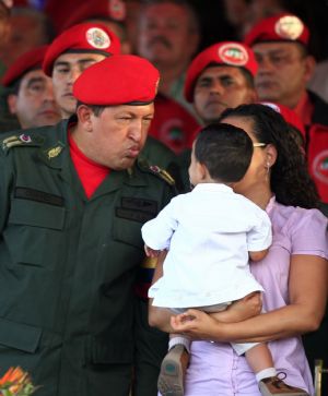 Venezuela's President Hugo Chavez kisses his grandson during a military parade in Maracay February 4, 2009. Chavez and his supporters celebrated the 17th anniversary of a failed coup which forged his political reputation. [Agencies]