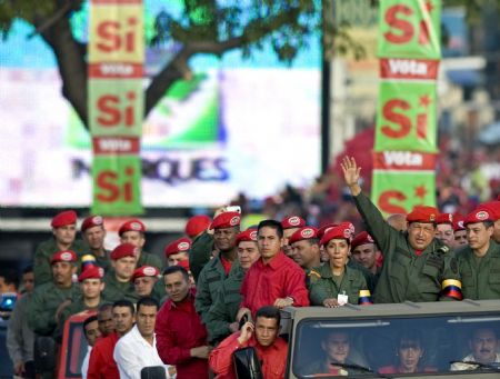 Venezuela's President Hugo Chavez salutes after arriving at a military parade in Maracay February 4, 2009. Chavez and his supporters celebrated the 17th anniversary of a failed coup which forged his political reputation. [Agencies]