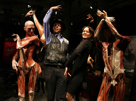 ![]() German anatomy professor Gunther von Hagens and his wife, German doctor Angelina Whalley, pose between plastinated human specimens during the presentation of the "Body Worlds" exhibition in Seville February 5, 2009. The exhibition of plastinated human bodies and body parts is on display from February 6 to May 5. [Agencies]