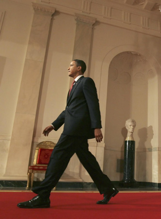 U.S. President Barack Obama walks through the Cross Hall to the East Room for his first news conference as president at the White House in Washington, February 9, 2009. [Agencies]