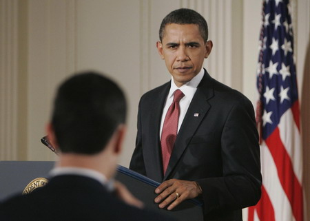 US President Barack Obama takes a question as he addresses his first news conference as president in the East Room of the White House in Washington, February 9, 2009. [Agencies]